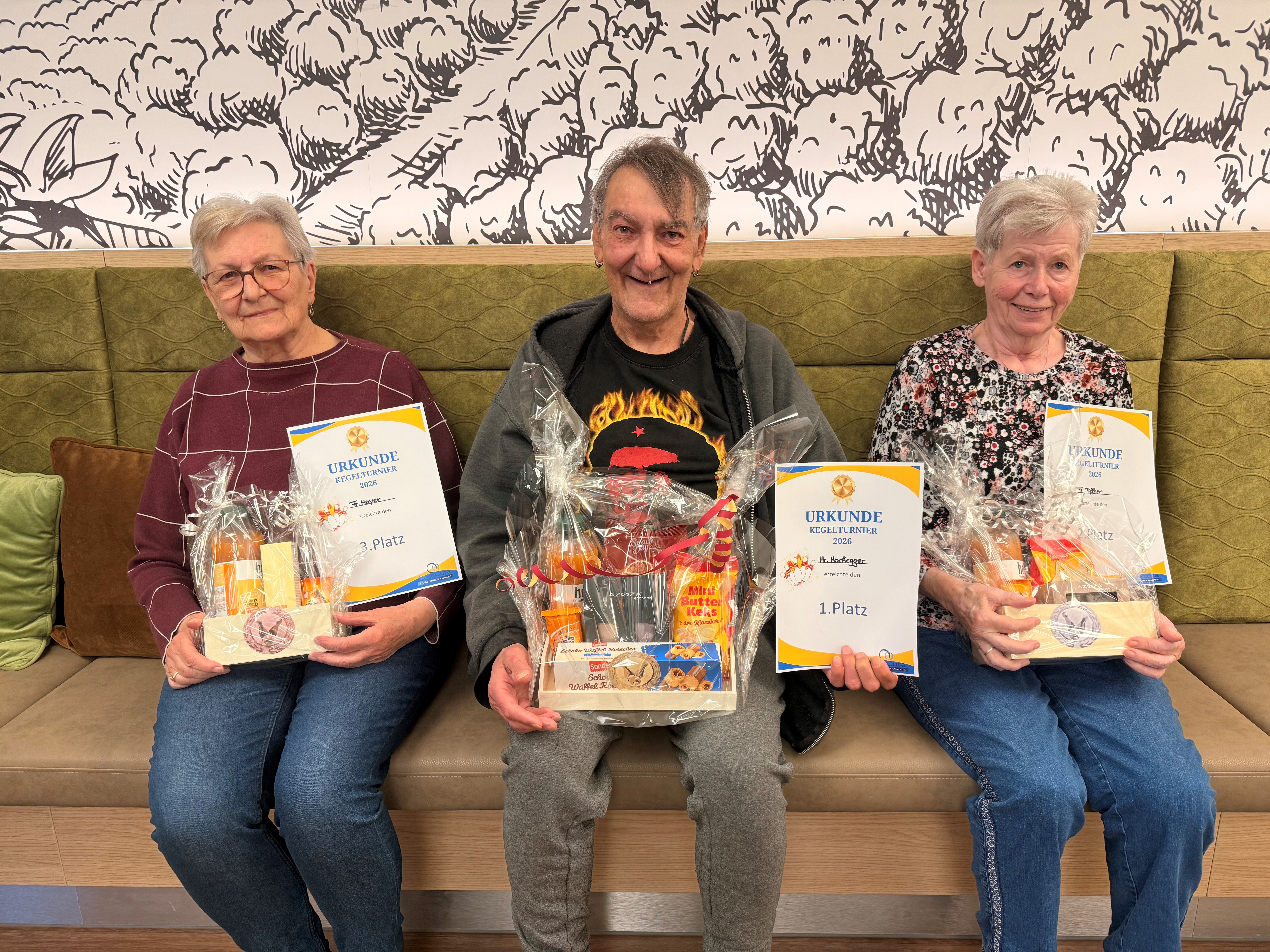 Im SeneCura Pflegezentrum Kalwang fand ein unterhaltsames Kegelturnier statt, bei dem die Bewohnerinnen und Bewohner mit viel Einsatz und Freude teilnahmen. In geselliger Atmosphäre wurde gekegelt, angefeuert und mitgefiebert. Der sportliche Ehrgeiz kam dabei ebenso wenig zu kurz wie der Spaß am gemeinsamen Erlebnis. Am Ende konnten sich Herr Hochegger über den ersten Platz, Frau Tiffner über den zweiten Platz und Frau Mayer über den dritten Platz freuen. Das Turnier war ein gelungener Nachmittag, der für Begeisterung sorgte und das Gemeinschaftsgefühl im Haus weiter stärkte.